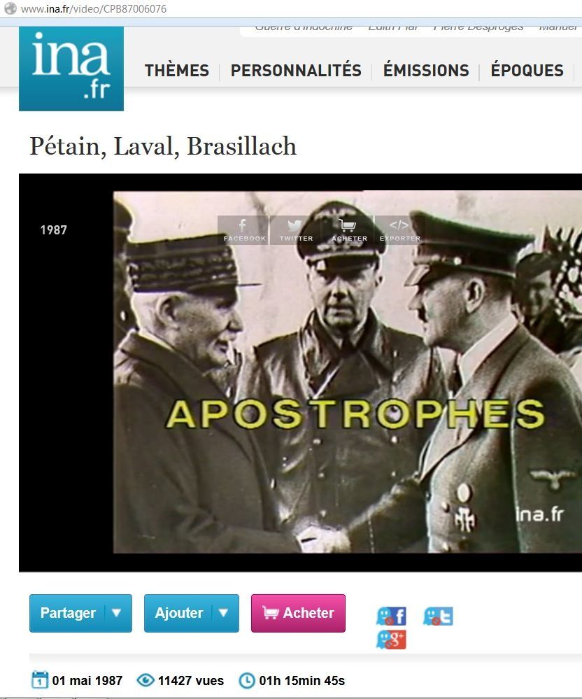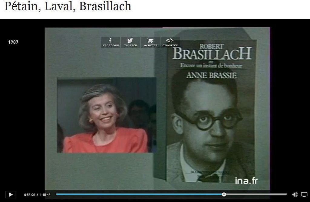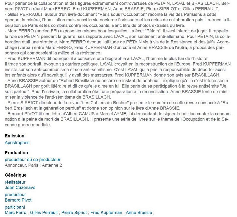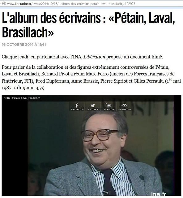 Le 16 octobre dernier, était proposée la fameuse émission dans laquelle, pour parler « de la collaboration et des figures extrêmement controversées de Pétain, Laval et Brasillach, Bernard Pivot a[vait] réuni Marc Ferro (ancien des Forces françaises de l’intérieur, FFI), Fred Kupferman, Anne Brassie, Pierre Sipriot et Gilles Perrault. (1er mai 1987, 01h 15min 45s) ».