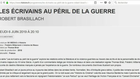 Deux articles récents à signaler dans le quotidien Présent : – le 5 décembre 2018 : est mentionnée la vente du cahier de philologie française de Brasillach, à Drouot ; – le 8 mars 2018, p.10 : une page sur Brasillach, "l'absent de tout bouquet", par Marie-Victoire Velut.