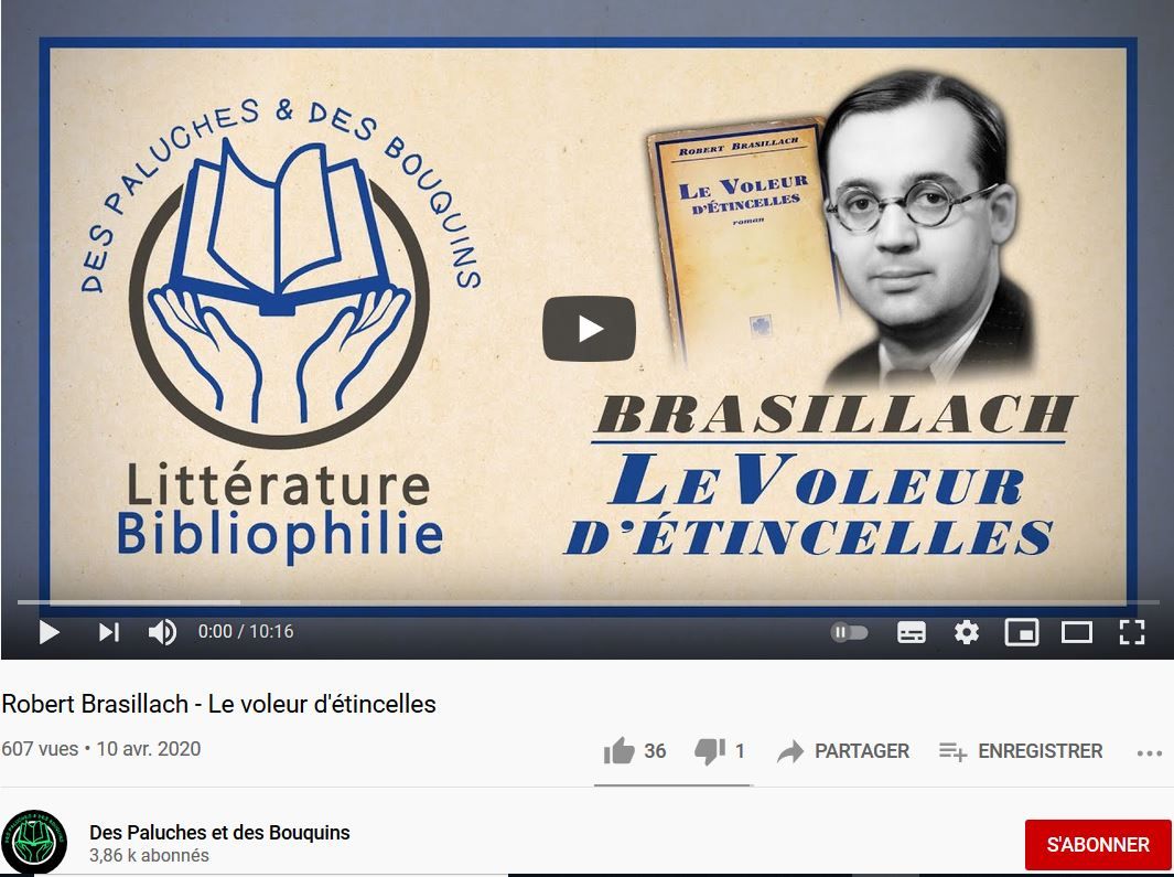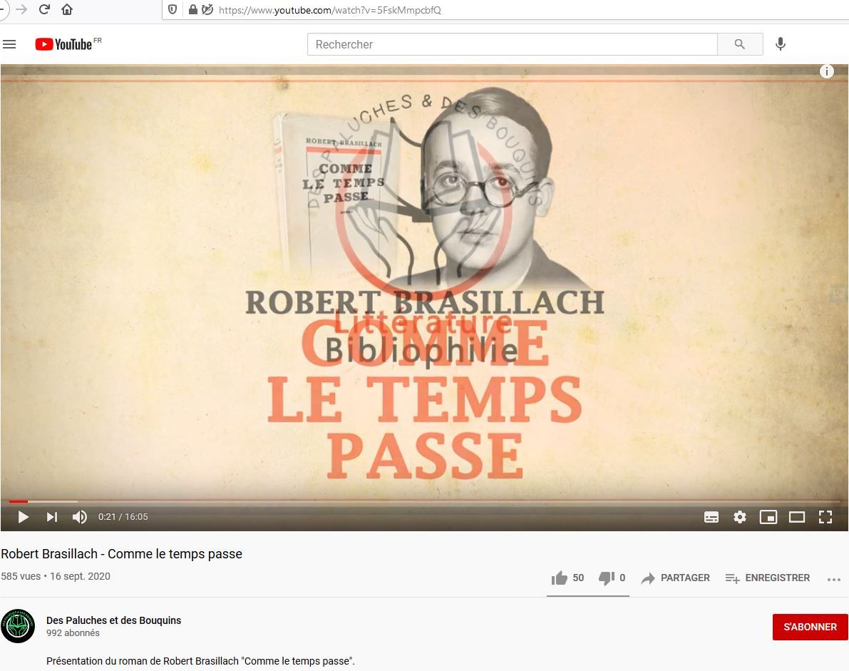 Présentation du roman de Robert Brasillach Comme le temps passe sur la page de vidéos "Des Paluches et des Bouquins" (Alexis Chevarnay, 16 septembre 2020) – privilégier désormais la page Odysee.