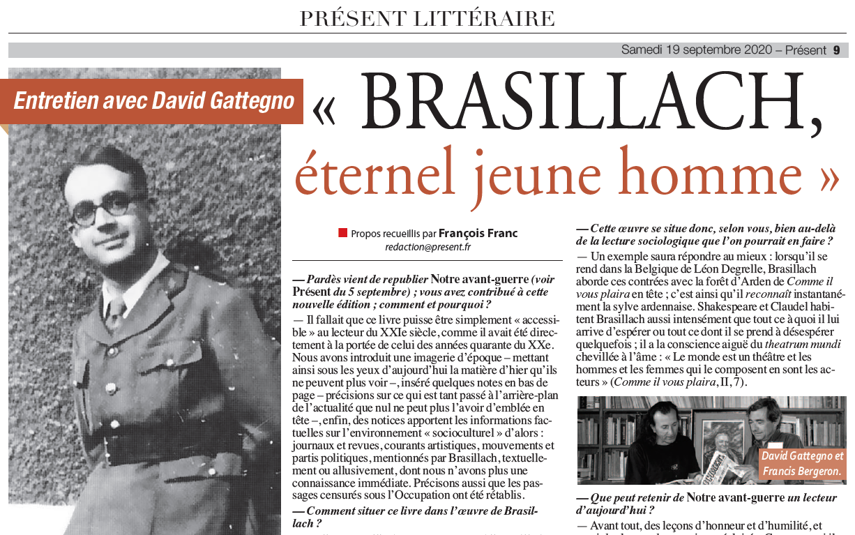 – « Notre avant-guerre de Brasillach » (rendant aussi compte du Théâtre complet et de Traductions de Shakespeare), par Robert Spieler, Rivarol, n°3441, 7 octobre 2020, p.10-11 ;