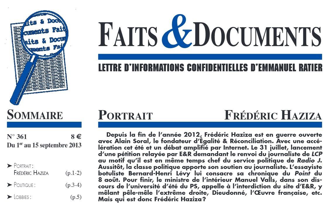 La lettre d'informations confidentielles d'Emmanuel Ratier, Faits & Documents, dont le n°361 a paru récemment, vient également de mettre en ligne un index de ses n°1 (mars 1996) à 348 (décembre 2012).