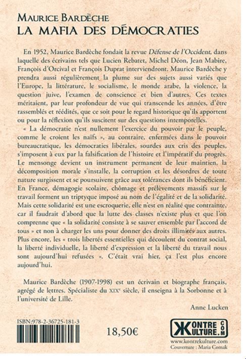 Vient de paraître aux éditions Kontre-Kulture La Mafia des démocraties, recueil inédit d'articles publiés par Maurice Bardèche dans sa revue Défense de l'Occident.