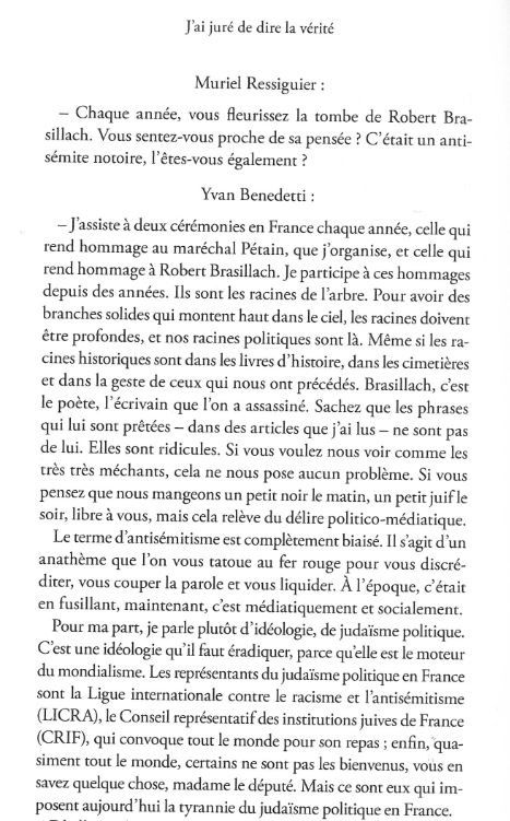 Lors de son audition du 25 avril 2019, dont le compte rendu a été mis en ligne temporairement sur le site de l'Assemblée nationale, puis publié dans Main levée face à la Commission d'enquête sur la lutte contre les groupuscules d'extrême droite… J'ai juré de dire la Vérité ! (Éditions du Faisceau, juillet 2019), Yvan Benedetti a été interrogé sur une cérémonie d'hommage à Robert Brasillach (p.80) :