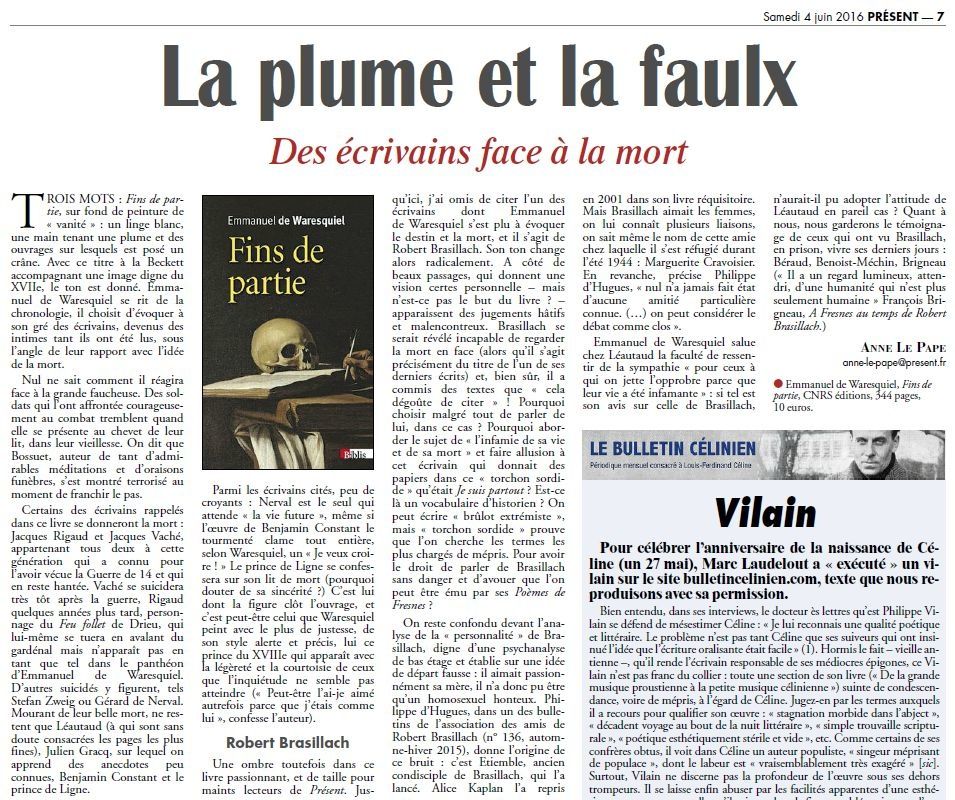 « Présent », 4 juin 2016 06 04 : Emmanuel de Warequiel sur Robert Brasillach