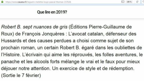 Parmi les conseils de lecture de Thomas Morales pour 2019 figure Robert B. sept nuances de gris, de François Jonquères : L'éditeur, dont on lira des propos plus généraux dans le magazine L'Incorrect (n°16, janvier 2019, p.16-17), ne fait pas franchement dans la nuance dans sa présentation du livre, reprenant la distinction usuelle entre un