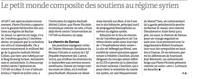 « La boucle est bouclée », comme l’on dit dans les articles de dénonciation du Monde, amalgameur en chef (cf. « Le petit composite des soutiens au régime syrien », 6 juin 2012, p.2).