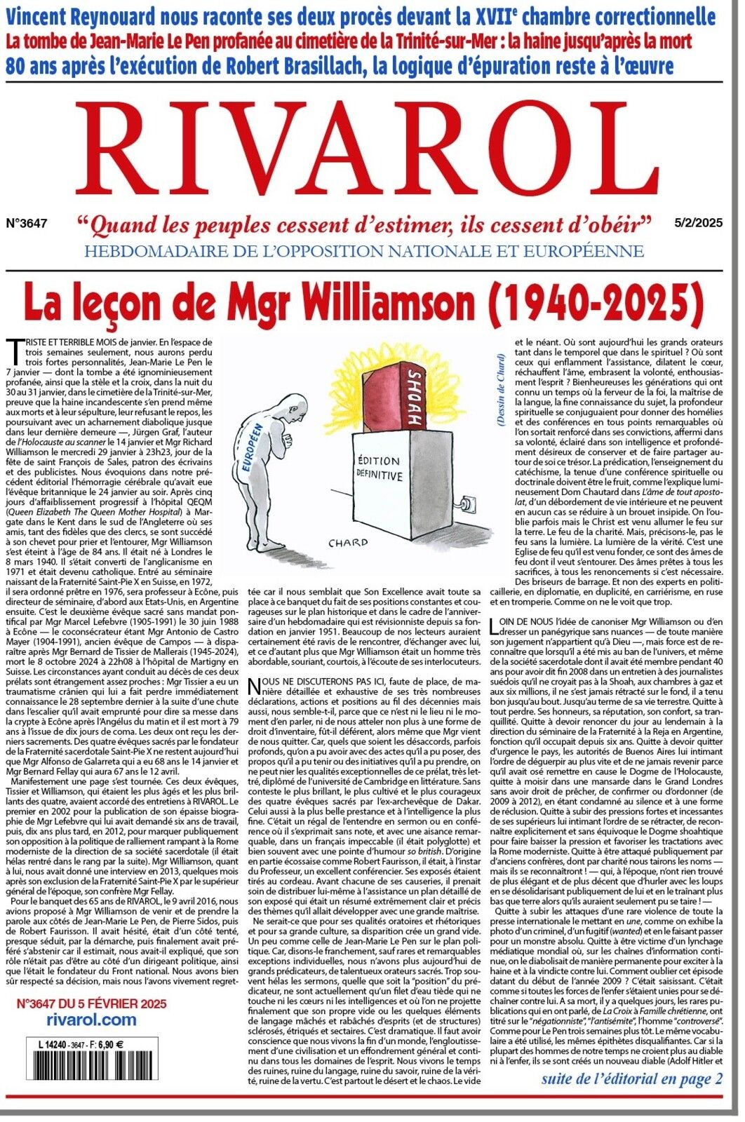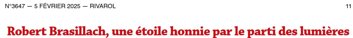 Paraît dans le prochain Rivarol (n°3647, 5 février 2025, p.11) une page signée Jean-Philippe Robiquet sur Robert Brasillach, avec une illustration de Projet KO (cf. son recueil Portraits).
